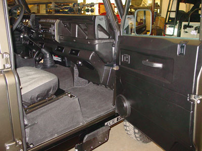 This images shows the 110 Wagon a little further along. The fenders have now been painted and installed and all the wiring run in them. The AC parts have gone into place as well as the safari cage. Next up the rear step, roof basket and rear ladder will go on to dress up the exterior and then we will start to install the black leather seats and get the sound system and other options wired in and ready to hook up.