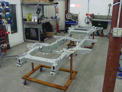 Here you can see the rolling chassis coming along nicely. The axles have been installed and the rear axle has been upgraded to disc brakes and the drive-train has been assembled and installed into the chassis. We try to get as much as we can installed on the motor before the body parts go on so that there is less chance of scratching the new Willow Green paint.